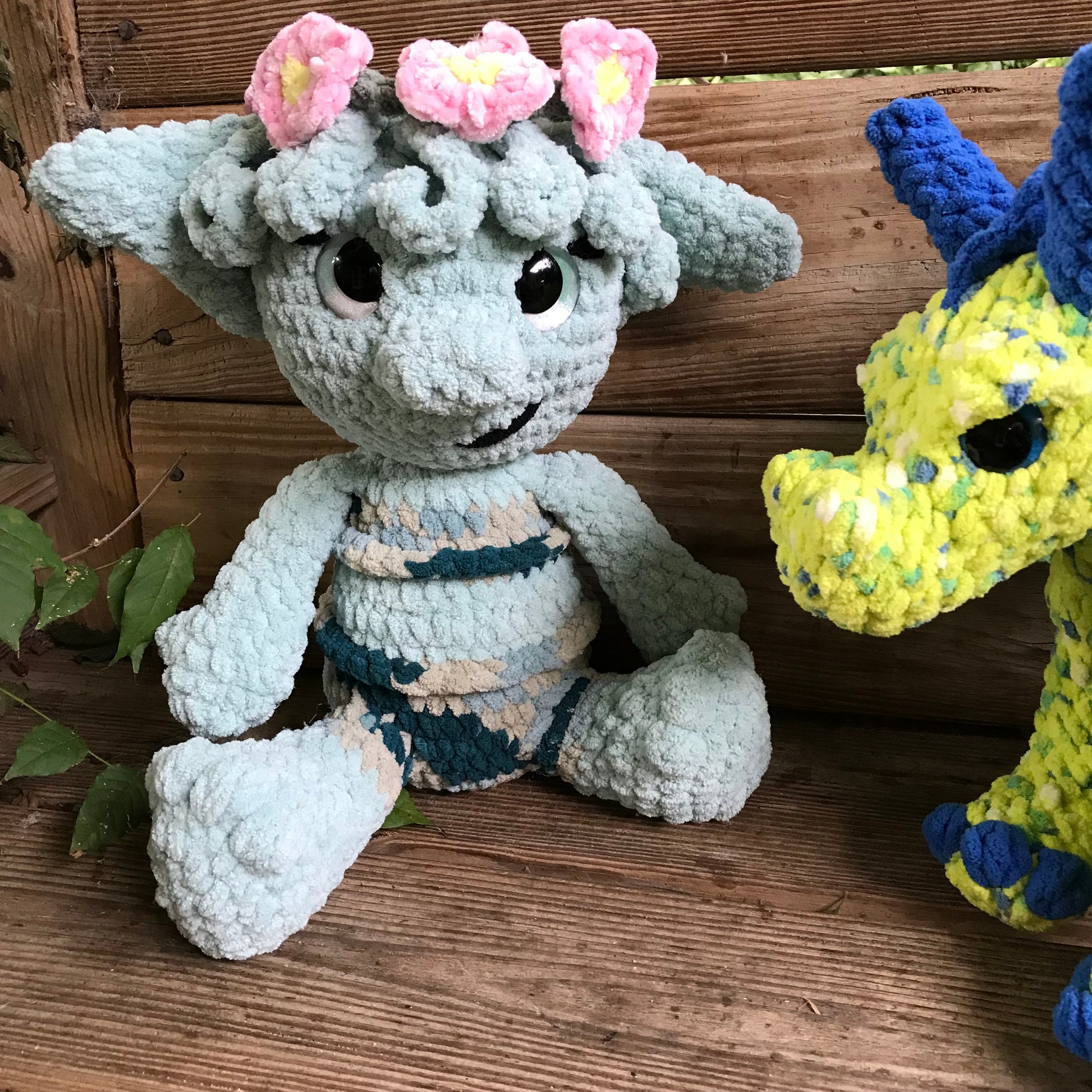 Meet your new magical friend—a hand-crocheted woodland troll girl bursting with charm! Adorned with lovely curls, sparkling eyes, and a cheerful flower wreath, she’s dressed in stylish clothes ready for woodland adventures. Perfect for adding whimsy and joy to any space or gifting to those who adore unique, handcrafted treasures.